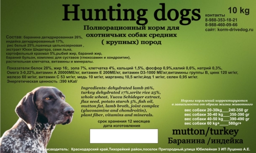 DRIVE DOG HUNTING DOGS Полнорационный корм для охотничьих собак средних (крупных) пород баранина / индейка, 15кг