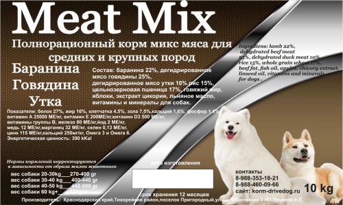 DRIVE DOG Meat Mix Полнорационный корм микс мяса для собак средних и крупных пород баранина / говядина / утка, 5 кг